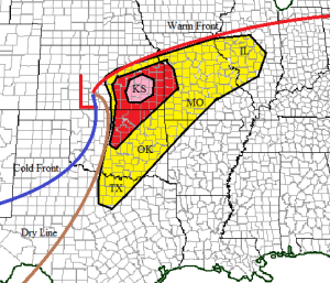 Severe thuderstorms will form Wednesday afternoon and evening, with large hail, damaging winds, and likely a few tornadoes. With temperatures in the 70's and 80's across the plains, and dew points in the low to mid 60's possibly reaching near 70, there should be plenty of instabillity for severe thunderstorms to form. The area with the best lift will probably be southeast Kansas as a cold front pushes into the area. As the cold front nears the dry line storms should explode across the red and magenta shaded areas. The area for the best chance to see a strong tornado tomorrow will be the magenta shaded area!