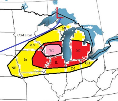 Severe thuderstorms will form Thursday afternoon and, with large hail, damaging winds, and likely a few tornadoes. With temperatures in the mid 70's across the north plains, and dew points in the low to mid 60's. The area with the best lift will probably be Illinois as a cold front pushes into the area along with a cold pocket aloft. The area for the best chance to see a strong tornado tomorrow will be the magenta shaded area!